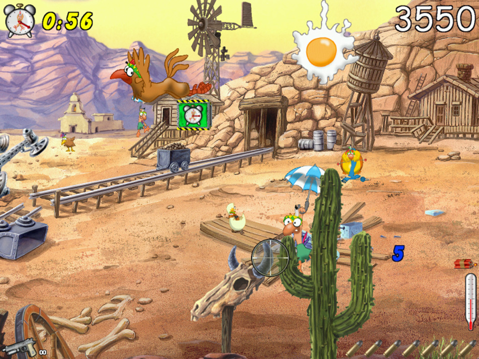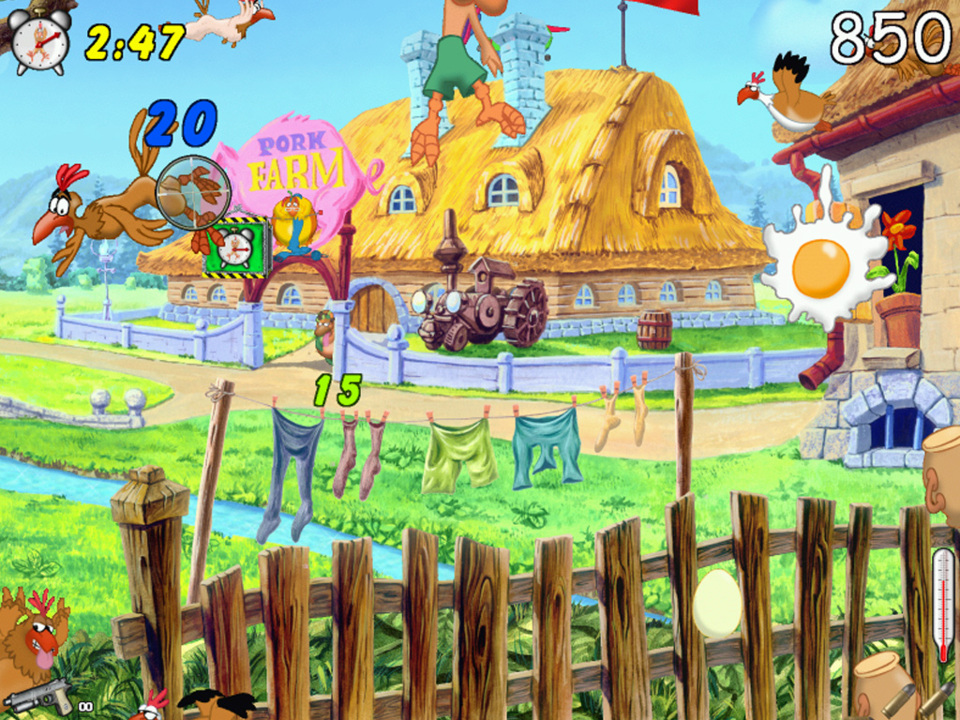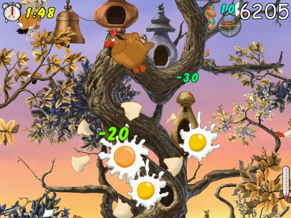 Ta banda pierzastych utrapieńców znowu daje się we znaki! Powstrzymaj rozbestwione kuraki przed sianiem zniszczenia w trybie zręcznościowym lub staw czoła zegarowi w trybie klasycznym - na trzech poziomach trudności! Na graczy czeka 6 przepięknych pejzaży, przepełnionych ukrytymi tajemnicami i żartami. Dziesiątki specjalnych efektów dźwiękowych oraz nastrojowa muzyka czynią zaś z gry rozrywkę nie tylko dla jednego gracza, ale dla całej rodziny, którą ubawią komiczne animacje, zaskakujące niespodzianki oraz wyjątkowo śmieszne dźwięki stada niesfornych kurczaków!